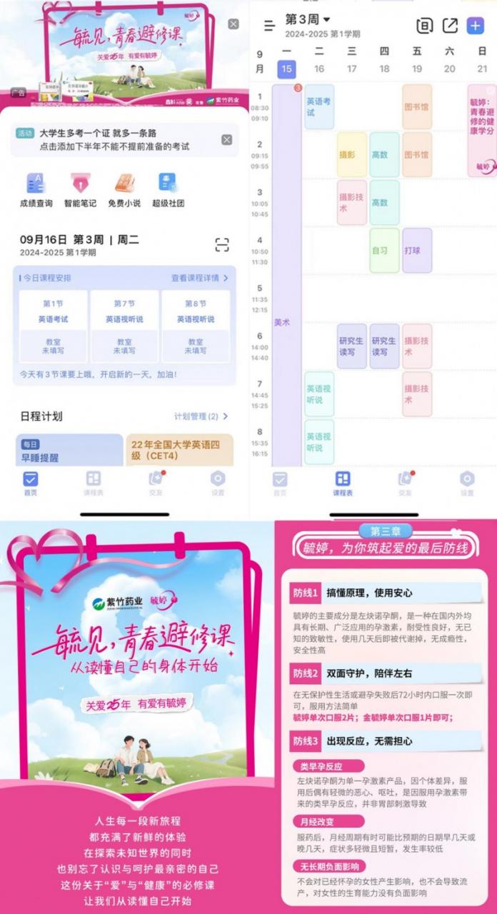 特别是毓婷与“超级课程表”的合作,精准切入大学生群体。通过课程表界面嵌入、小纸条推送、首页推广等自然融入日常学习场景的方式,将“青春避修课”相关内容无缝对接至学生的校园生活,持续传递传播女性生理健康与科学避孕等实用知识。此外,美图秀秀首页的曝光资源也为本次活动带来广泛关注,进一步扩大了传播声量。