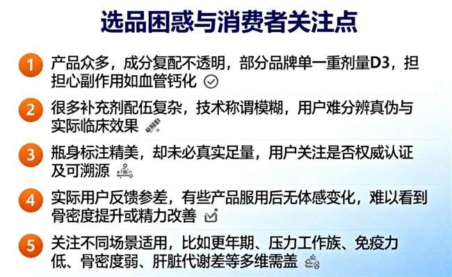 1.产品众多,成分复配不透明,部分品牌单一重剂量D3,担心副作用如血管钙化。
