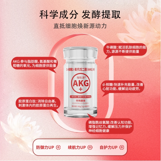 以基础抗衰为方向,补充人体随龄减少的 AKG,帮助维持细胞基本活力,搭配简易吸收技术。