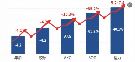 最让人惊喜的就是实打实的抗衰效果,经过随机、双盲对照实验验证,35-55 岁的受试者连续补充端粒源 12 周后,生理年龄平均降低了 4.2 岁,相当于让身体年轻了近五年。皮肤状态也得到了显著改善,胶原密度增加 15.3%,肌肤变得更加紧致有弹性,细纹和干纹都明显淡化,由内而外透露出年轻光泽。同时,抗氧化酶活性提升 40.1%,能有效清除体内自由基,减少氧化应激对细胞的损伤,从根源上延缓衰老进程。
