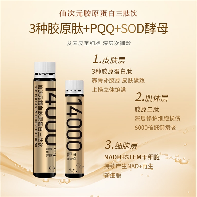 每瓶含14000mg顶级胶原蛋白肽总含量(极高浓度),其中鱼胶原蛋白肽12000mg来自北纬66°挪威黄金深海鳕鱼,吸收率近100%;鳕鱼胶原三肽2000mg,是活性分子最低片段,修护力更强;弹性蛋白肽100mg增强肌肤弹力。除此之外,协同添加PQQ(线粒体能量王者)、SOD酵母(抗氧化天花板)、雨生红球藻虾青素(改善暗沉)、GABA(调节情绪,修复睡眠)、透明质酸钠(深层补水),所有成分均经过临床验证,配比具备诺奖理论支撑。