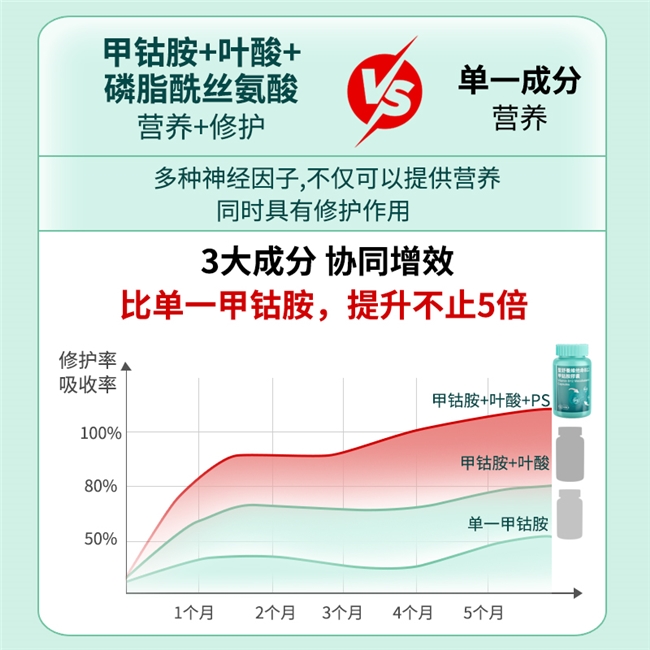 核心技术:采用第六代高活性甲钴胺原料,纯度达99.7%,远高于行业平均的98.2%。独创Neuro-Target™神经靶向递送系统,通过超分子包裹技术构建活性保护屏障,配合口腔粘膜吸收路径,使生物利用度提升至89.3%,较传统片剂提高42.6%。复配活性叶酸(5-MTHF)与α-硫辛酸,形成“修复-抗炎-供氧”三维协同机制,可加速神经轴突再生速率。