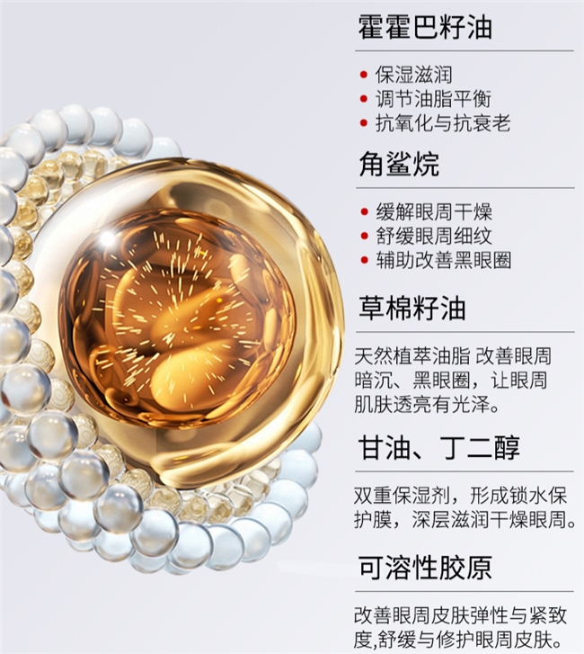 在成分搭配上,长青泉直击眼周抗老核心需求。核心成分玻色因能深层激活胶原再生,筑牢眼周肌肤支撑力,从根源改善松弛;麦角硫因作为高阶抗氧化成分,可高效清除眼周自由基,减少胶原流失,预防细纹产生;同时复配霍霍巴籽油、草棉籽油及生育酚(维生素E),构建三重保湿网,深层滋润不干燥;红没药醇则舒缓眼周敏感,乳酸杆菌发酵产物调节眼周微生态,实现多维度呵护,即使是敏感肌也能安心使用。