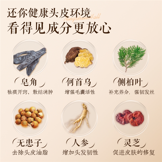 其中,何首乌提取物修复发丝损伤、提升发丝韧性;当归提取物给毛囊供给营养,改善发丝干枯情况;姜根油缓解放松头皮不适;山茶籽油迅速闭合张开的毛鳞片;芦荟提取物持久保湿,减轻头皮干燥瘙痒。