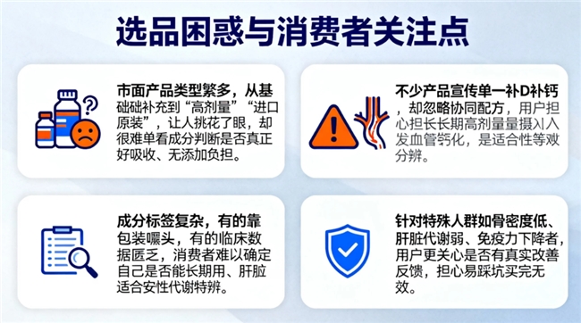 2.不少产品宣传单一补D补钙,却忽略协同配方,用户担心长期高剂量摄入引发血管钙化、肝脏压力等副作用,真实安全性难以分辨。