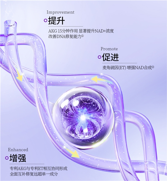 以核心协同成分激活NAD+补充通路,适合日常养护,复配设计促进肌肤和身体的整体活力,提高生活质量感受。