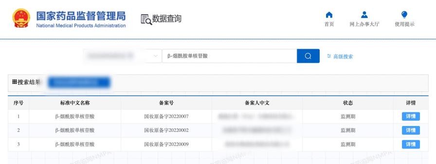 近日,据国家药监局化妆品原料备案信息平台公布的信息显示,原料β-烟酰胺单核苷酸原料(英语简称:NMN)完成备案。4个月内,已有三家公司相继备案成功,可见该原料之火爆。