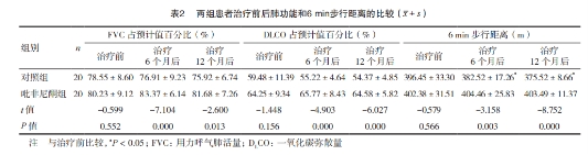 治疗6个月、12个月后,吡非尼酮胶囊组的FVC、DLCO占预计值百分比及6分钟步行距离均高于对照组。