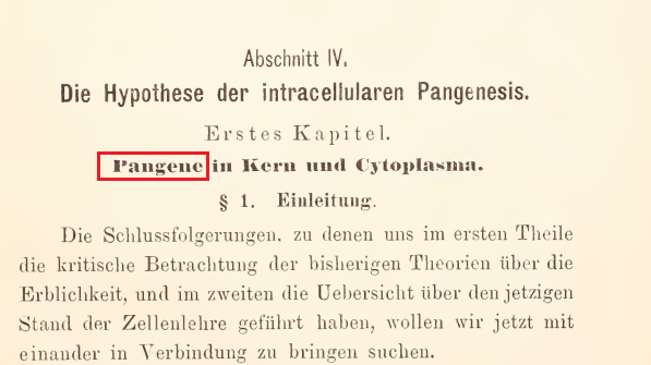 “……每个生殖细胞都必须潜在地包含构成相关物种性状的所有因素。因此,可见的遗传现象,都是隐藏在生命物质中的最小不可见粒子的特性的表现。事实上,为了能够解释所有的现象,人们必须为每个遗传属性假设特殊的粒子。我将这些单位称为泛生子 (Pangene)。这些泛生子 小得无法看见,但它们的化学分子的顺序完全不同,这些泛生子 能够随着细胞分裂而增殖,并且可以分布到生物体所有或几乎所有的细胞中。它们要么是潜伏的,要么是活动的,但可以在这两种状态下繁殖……”