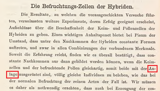 “ ……就经验而言,我们发现每一种情况下都证实,只有在卵细胞和受精花粉具有相同的天性 (Anlage)时才能形成不变的后代,正如纯种植株的正常受精一样…….”