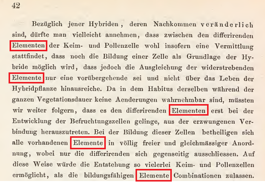 有趣的是,“天性” (Anlage)这个词孟德尔在整篇文章里只使用了这一次。等到文章的结语部分讨论控制性状的遗传物质的时候,他用了另外一个名词 “Elemente”,而且用了10次之多。Elemente有三种不同的含义:基本成分、特质、因子。从孟德尔论文的语境来看,这里的 “Elemente” 翻译成 “因子” 更合适一些。