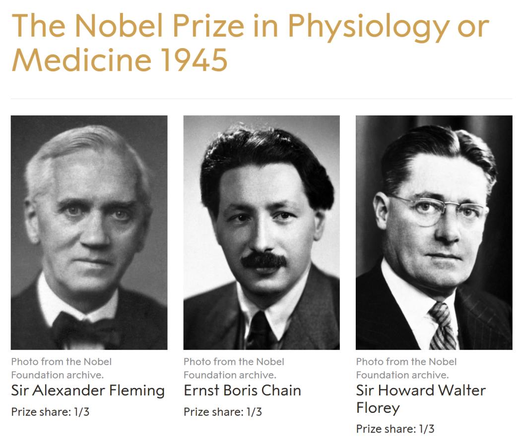 1945 年诺贝尔生理学或医学奖被联合授予亚历山大·弗莱明爵士、恩斯特·鲍里斯·钱恩爵士和霍华德·沃尔特·弗洛里爵士,以表彰他们“发现了青霉素及其对各种传染病的疗效”。