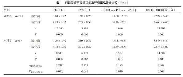 如下表所示,治疗前,两组的肺功能(TLC、FVC、DLCO)、UCSD、SOBQ评分比较差异无统计学意义(P > 0.05),但治疗3个月后,两组的上述各项指标均有改善,但观察组(常规治疗方案 + 吡非尼酮胶囊治疗)的改善幅度显著优于对照组。